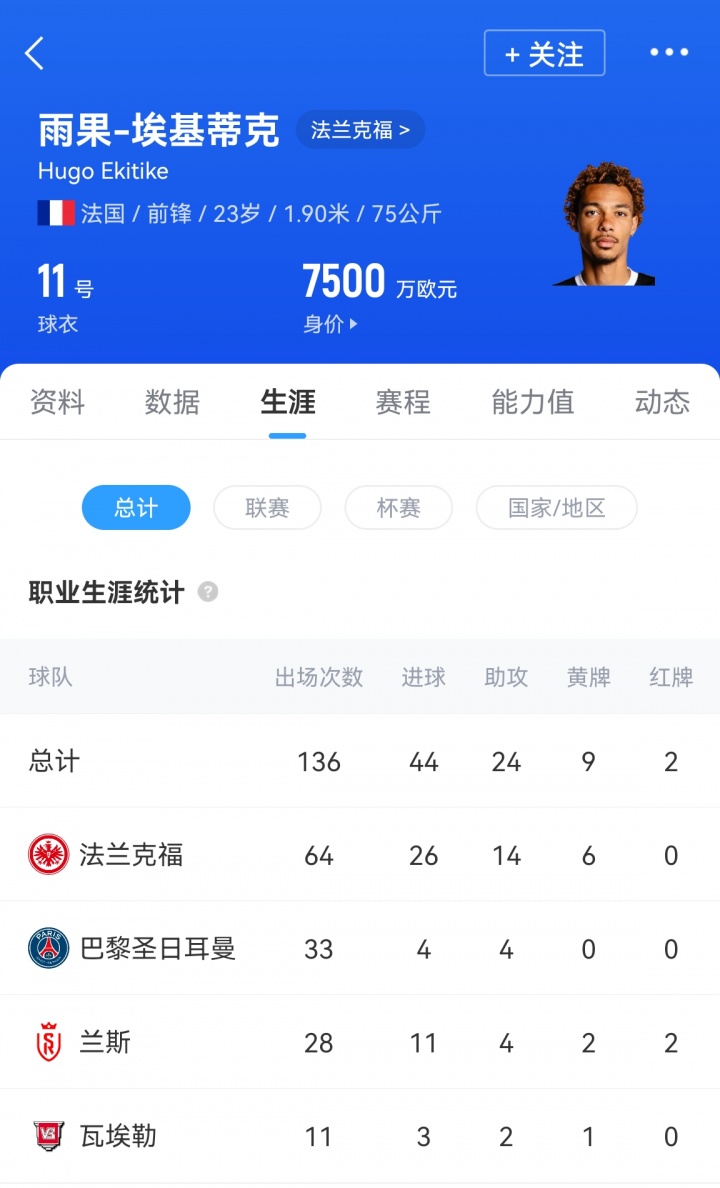 埃基蒂克2024年夏窗正式从巴黎加盟法兰克福,当时的转会费为1650万欧元。
